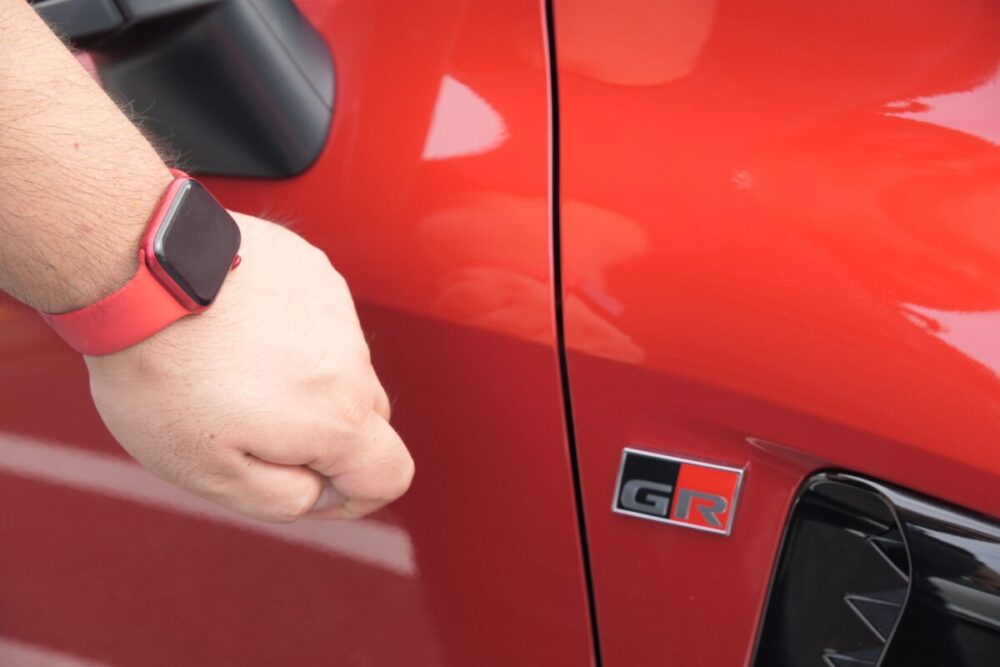 そう話す、あれくさーは熊の人さんの腕には、赤いベルトを装着したAppleWatchが!! この赤いGRカローラに乗る前の車両は「赤いスイフトスポーツ」だったとのこと。徹底していますね〜。