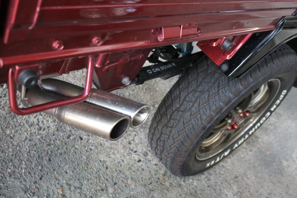 車体サイドから2本出しの特徴的なエキゾースト。NA、ターボそれぞれに対応した2種類を展開している(ハイゼット用)
