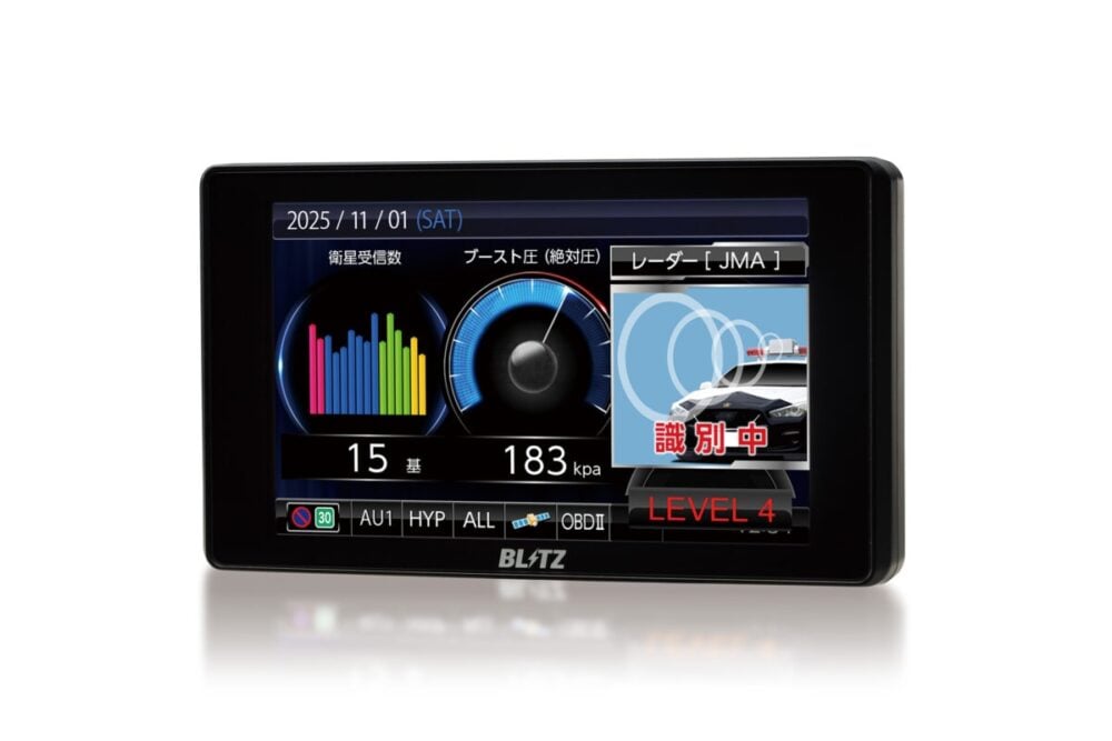 同製品は、業界最大の4インチ液晶を採用し、日本無線製の最新取締機「JMA-600」にも対応。誤警報の多いXバンドについても従来比で約85%低減されている。常時最新データへ更新可能な通信機能に加え、専用OBDⅡアダプターによる詳細な車両情報表示にも対応する高性能モデルである。
