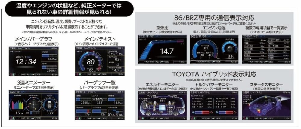 また、OBDⅡを使用した表示項目は車種により異なります。詳しくはBLITZホームページをご確認ください。