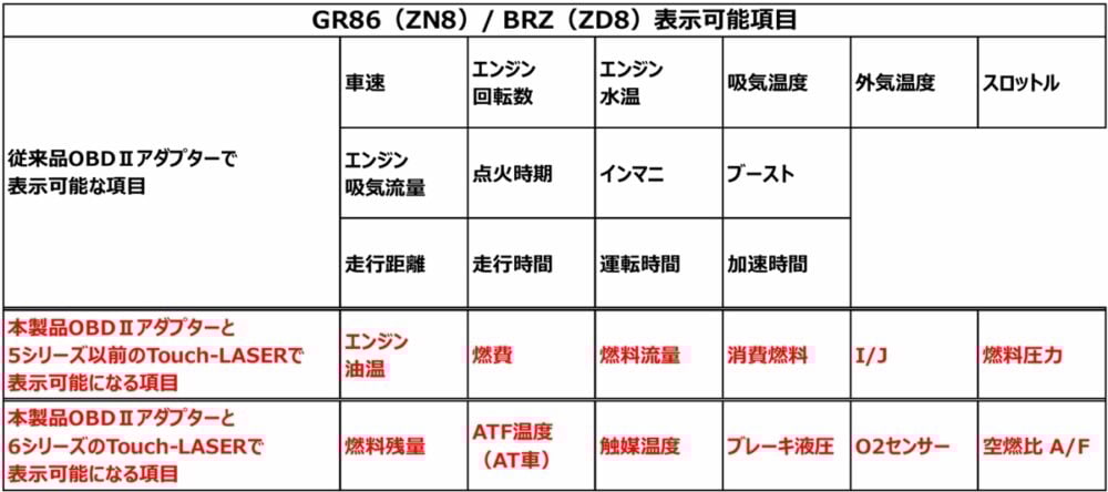 ※赤字が本製品「OBD2-BR1A-86」を使用しGR86(ZN8)/BRZ(ZD8)専用通信で表示可能となる項目です。