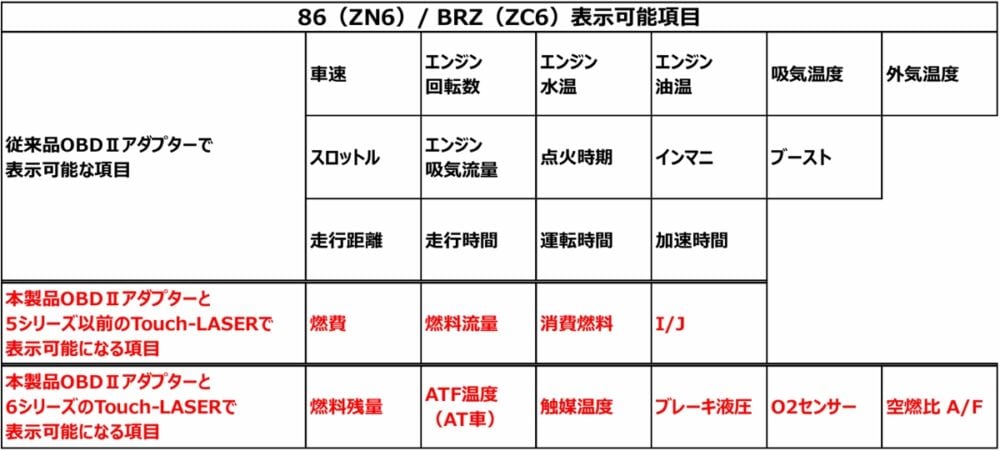 ※赤字が本製品「OBD2-BR1A-86」を使用し86(ZN6)/BRZ(ZC6)専用通信で表示可能となる項目です。